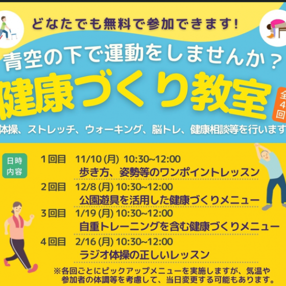11月10日(月)、12/8 (月)、1/19 (月)、2/16 (月)健康づくり教室を開催します!